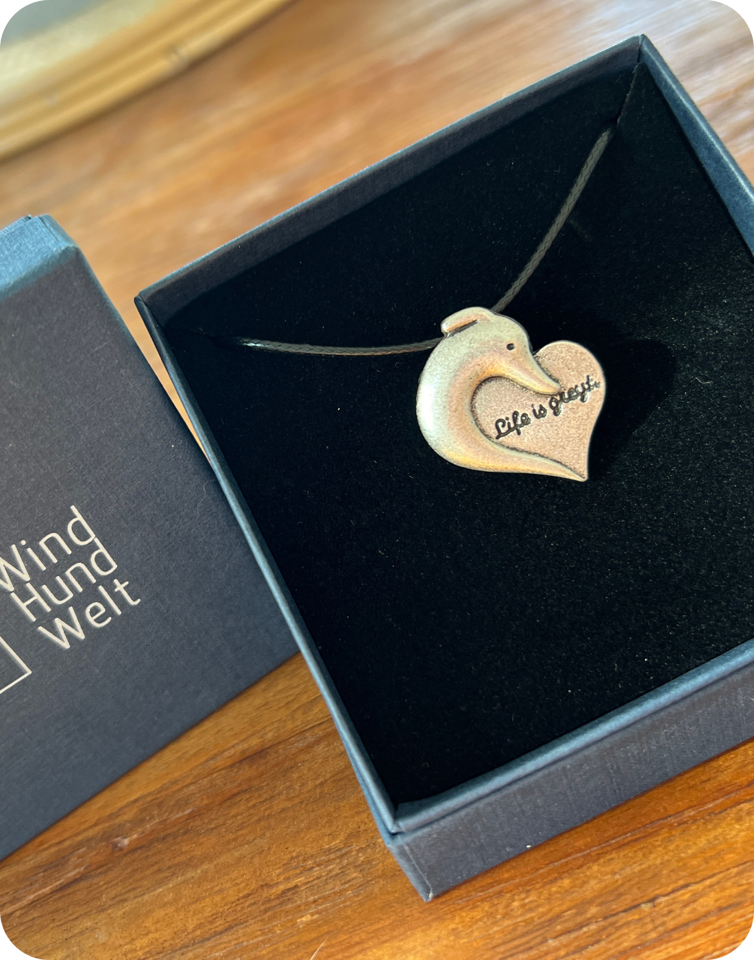 Unsere "Life is greyt" - Kette ist ein stilvolles Statement, die den Charme eines Galgos und die Schönheit eines Herzens vereint. Jedes Stück dieser einzigartigen Kette strahlt Liebe, Leidenschaft und die Freude am Leben aus.